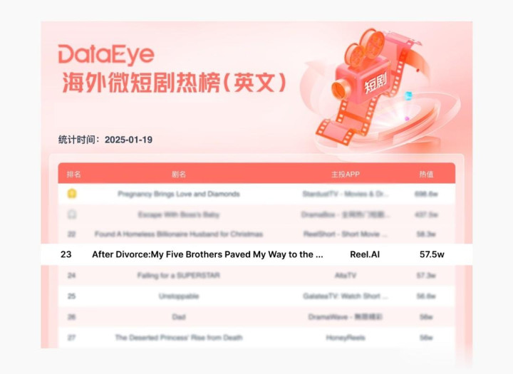 AI 短剧的热度还烧到了国外,《After Divorce》登顶短剧周榜,热力值超 500 万,成为全球首部跻身畅销榜的 AI 短剧。